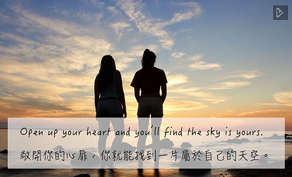 Open up your heart and you’ll find the sky is yours. 敞開你的心扉,你就能找到一片屬於自己的天空。